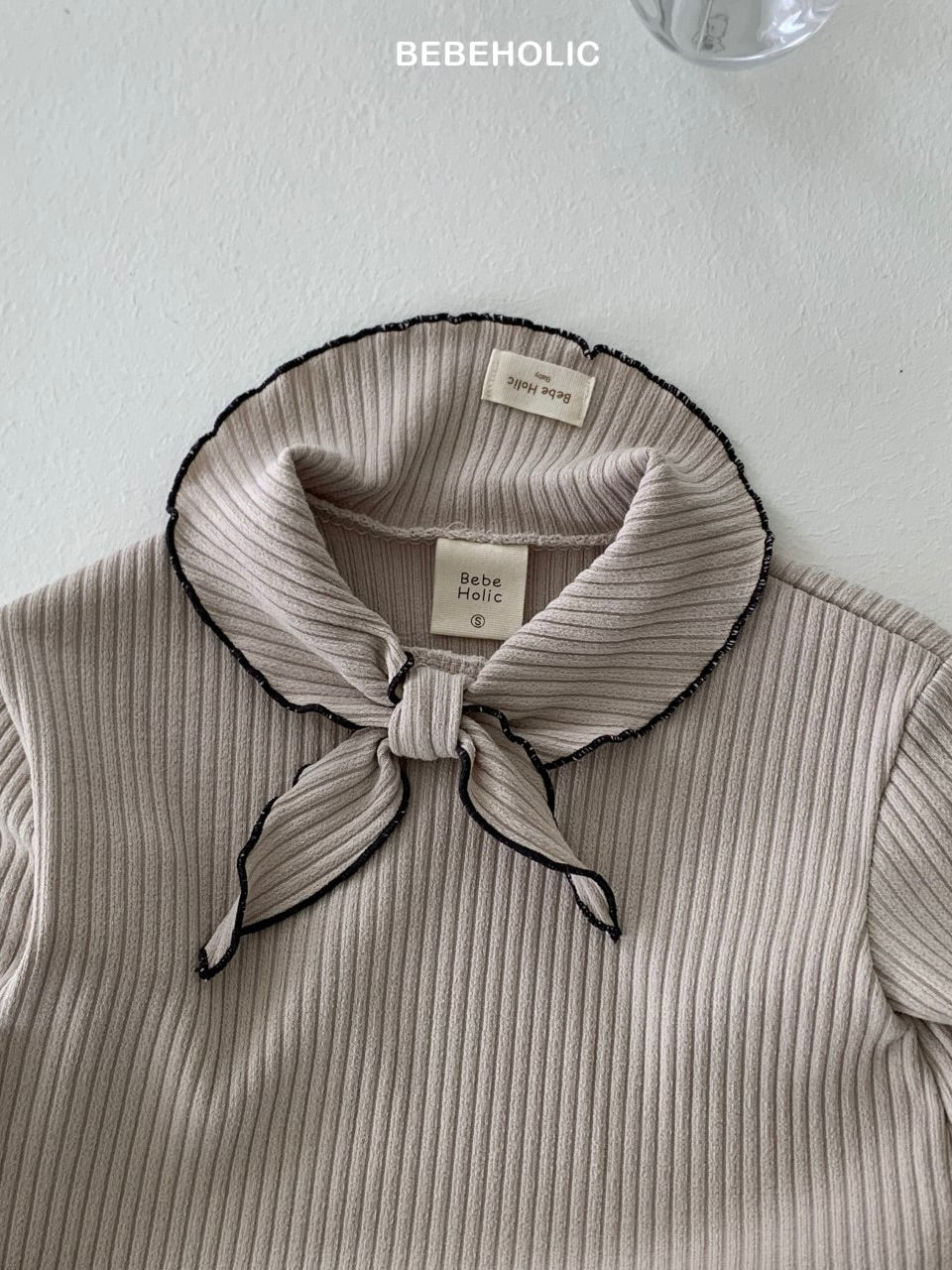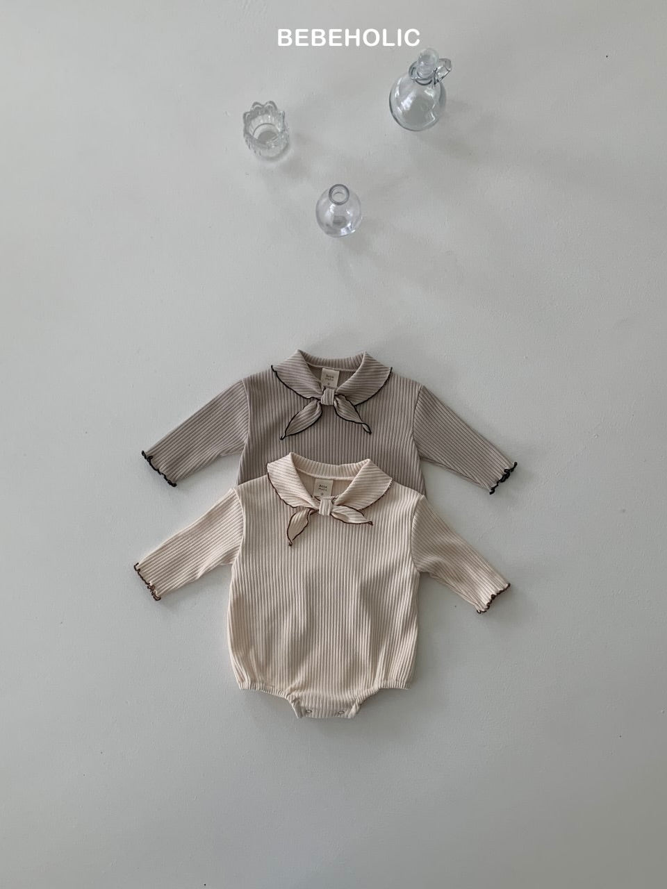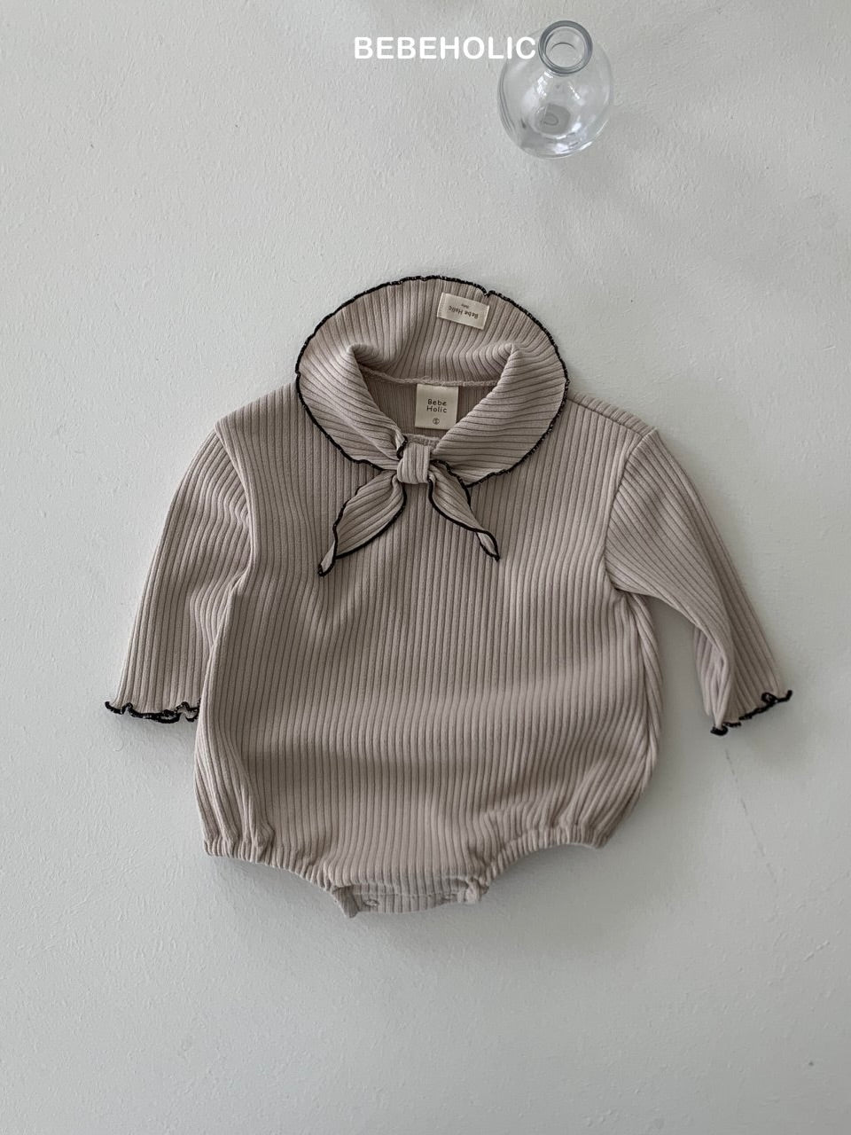 胸元で優しく結ばれたスカーフが可愛らしい、ナチュラルカラーのリブロンパース。