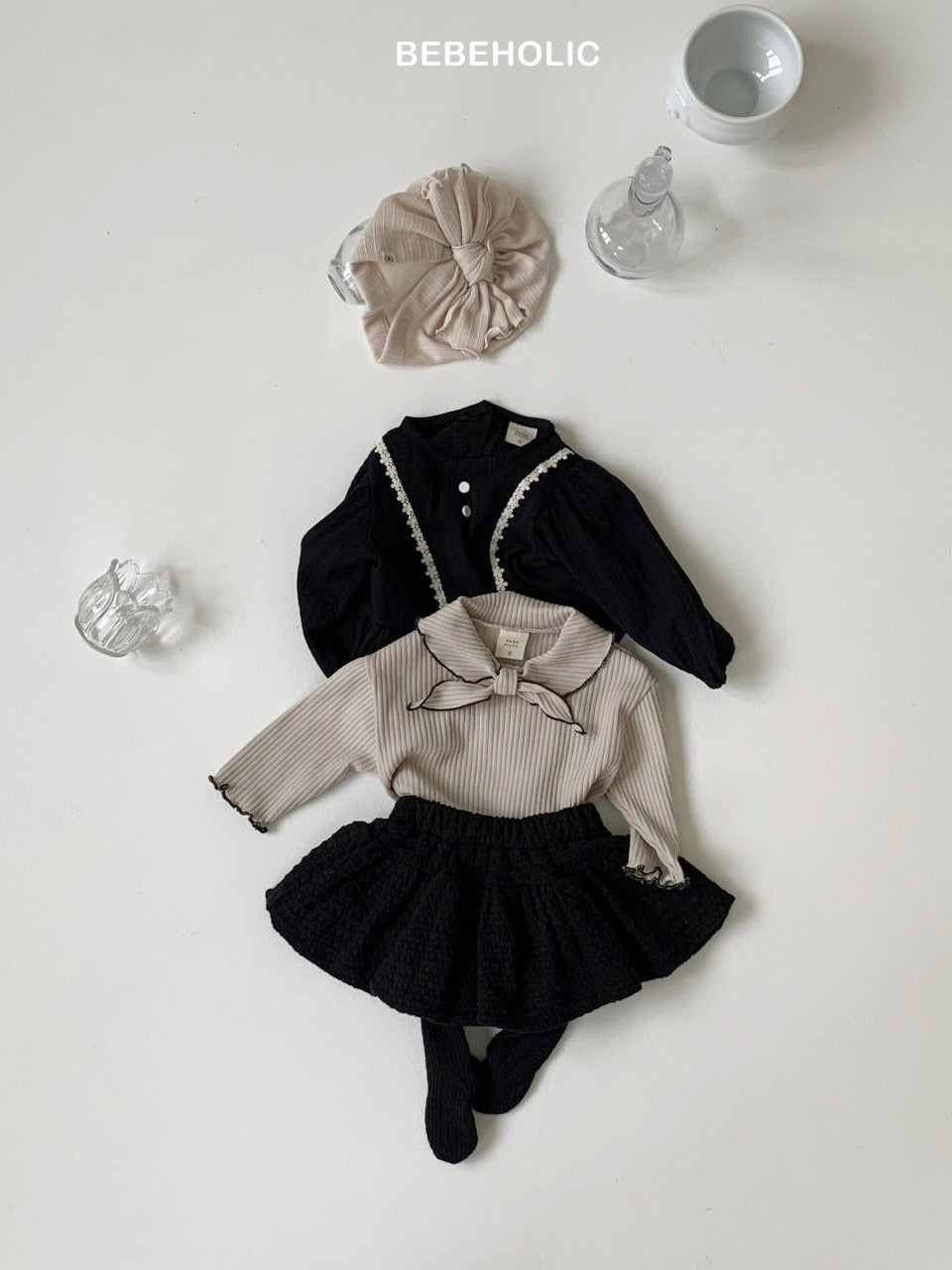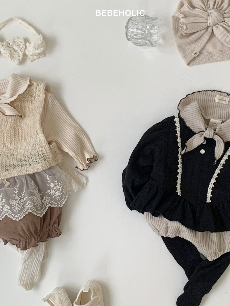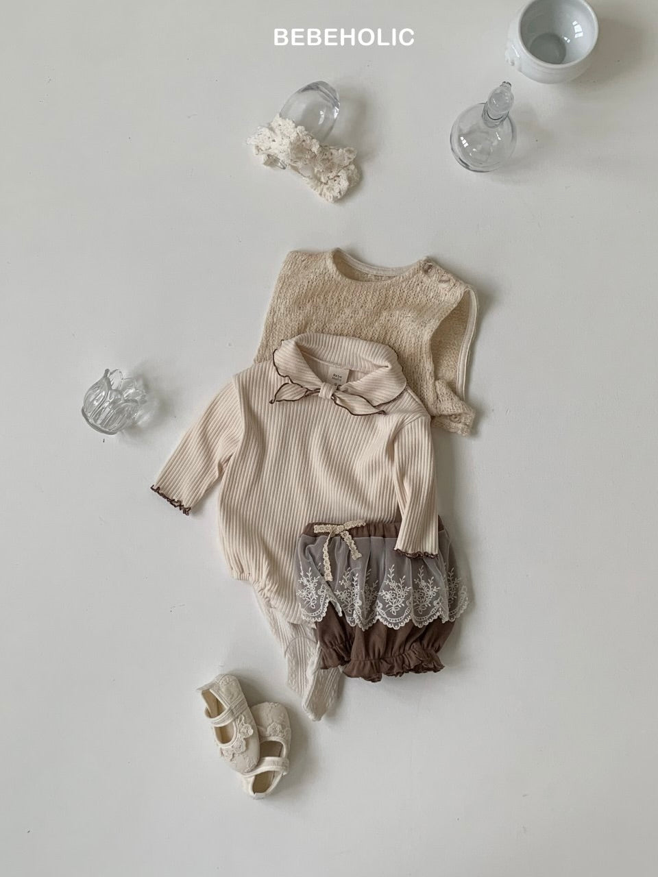 胸元で優しく結ばれたスカーフが可愛らしい、ナチュラルカラーのリブロンパース。